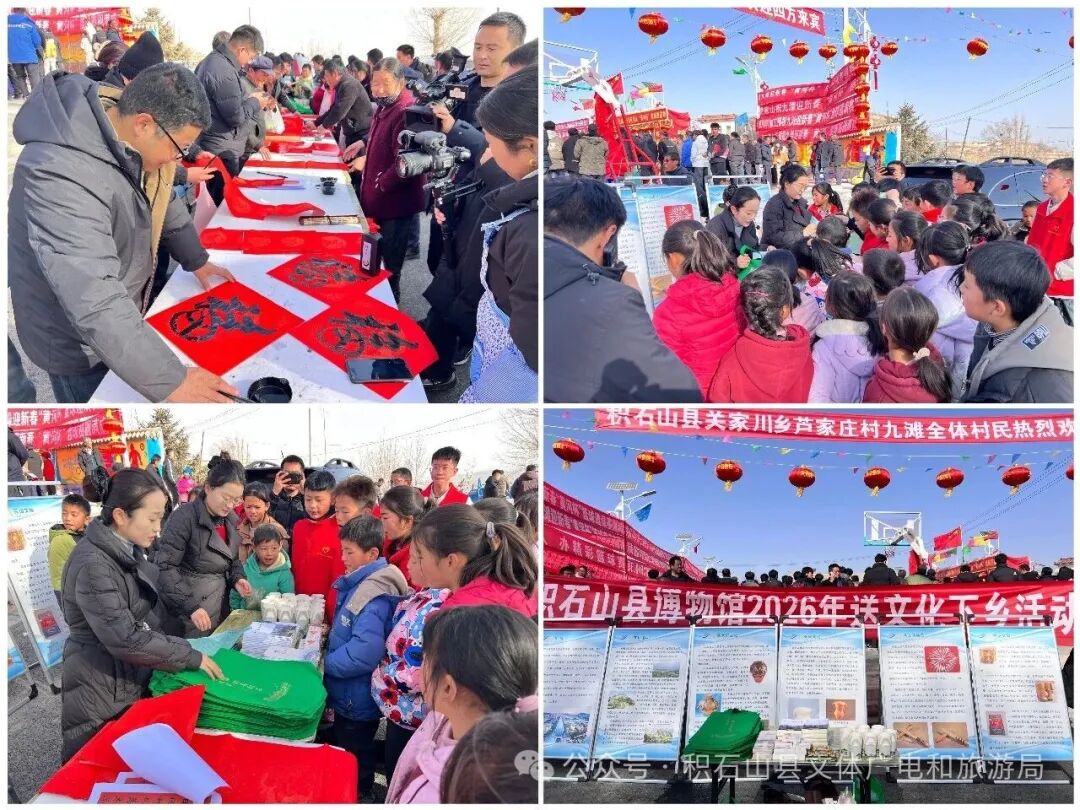 文艺演出以舞蹈《盛世花开》开场,演员们舞姿灵动,随后《欢乐的海洋》《绣出个美好的明天》等节目轮番上演,赢得阵阵掌声;本土大眼睛乐队带来《好姻缘配成着哩》等原创歌曲,将积石山“花儿”小调与现代音乐结合,尽显地域特色。活动现场,县文化馆干部和书法爱好者们现场书写并赠送春联福字,县博物馆开展流动展览,讲解员现场讲解并免费赠送文创产品,让村民足不出村感受文化魅力,厚植文化自信。