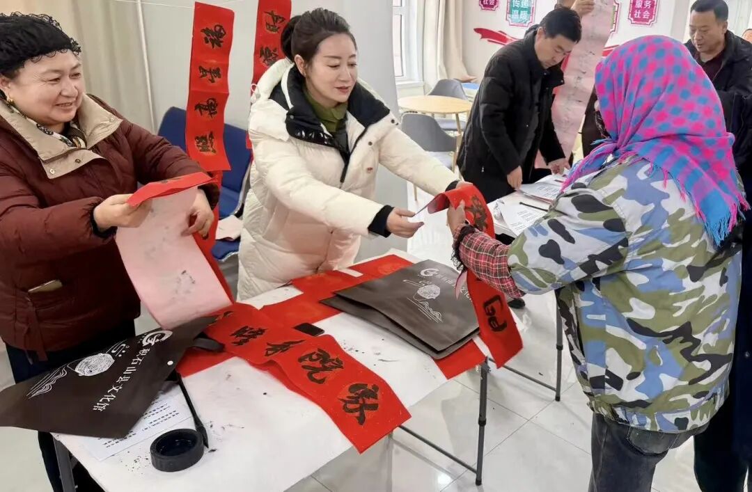 活动现场墨香袅袅、喜气洋洋,文化馆书画工作者与文化志愿者铺纸研墨、挥毫泼墨,一笔一画尽显笔墨功力,一幅幅饱含新春祝福的春联、一个个圆润喜庆的福字接连落成。党员干部化身志愿宣传员、配送员,将写好的春联福字与精心准备的文化宣传用品逐一送到社区居民手中,与群众唠家常、问需求,宣传文化惠民政策,让基层群众在笔墨馨香中感受浓浓年味与党组织的关怀。