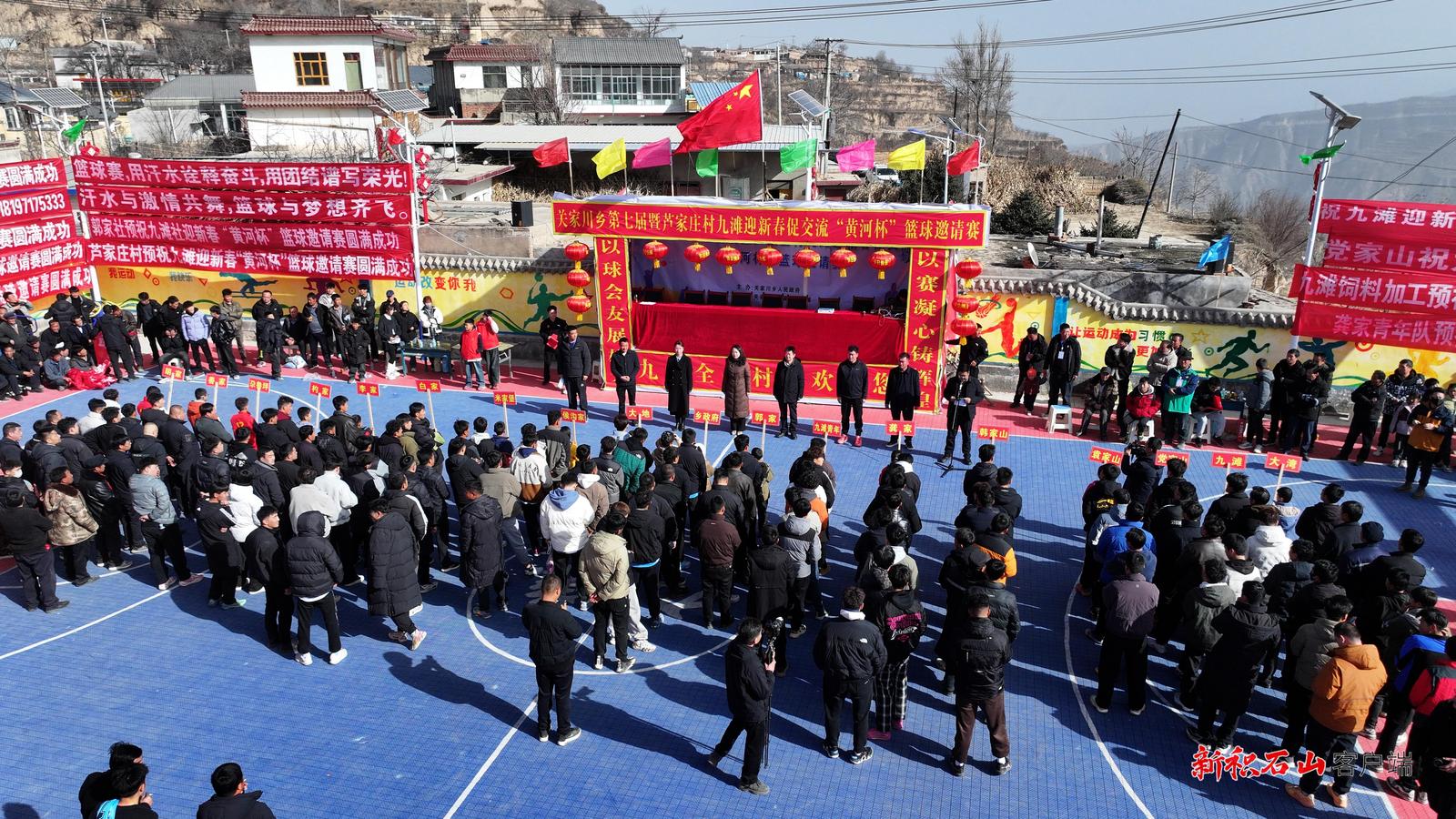 1月27日,关家川乡第七届农民运动会暨芦家庄村九滩迎新春促交流“黄河杯”男子篮球邀请赛团体拔河比赛在芦家庄村九滩篮球场开幕。县领导蓝婷、马忠勇参加开幕活动。